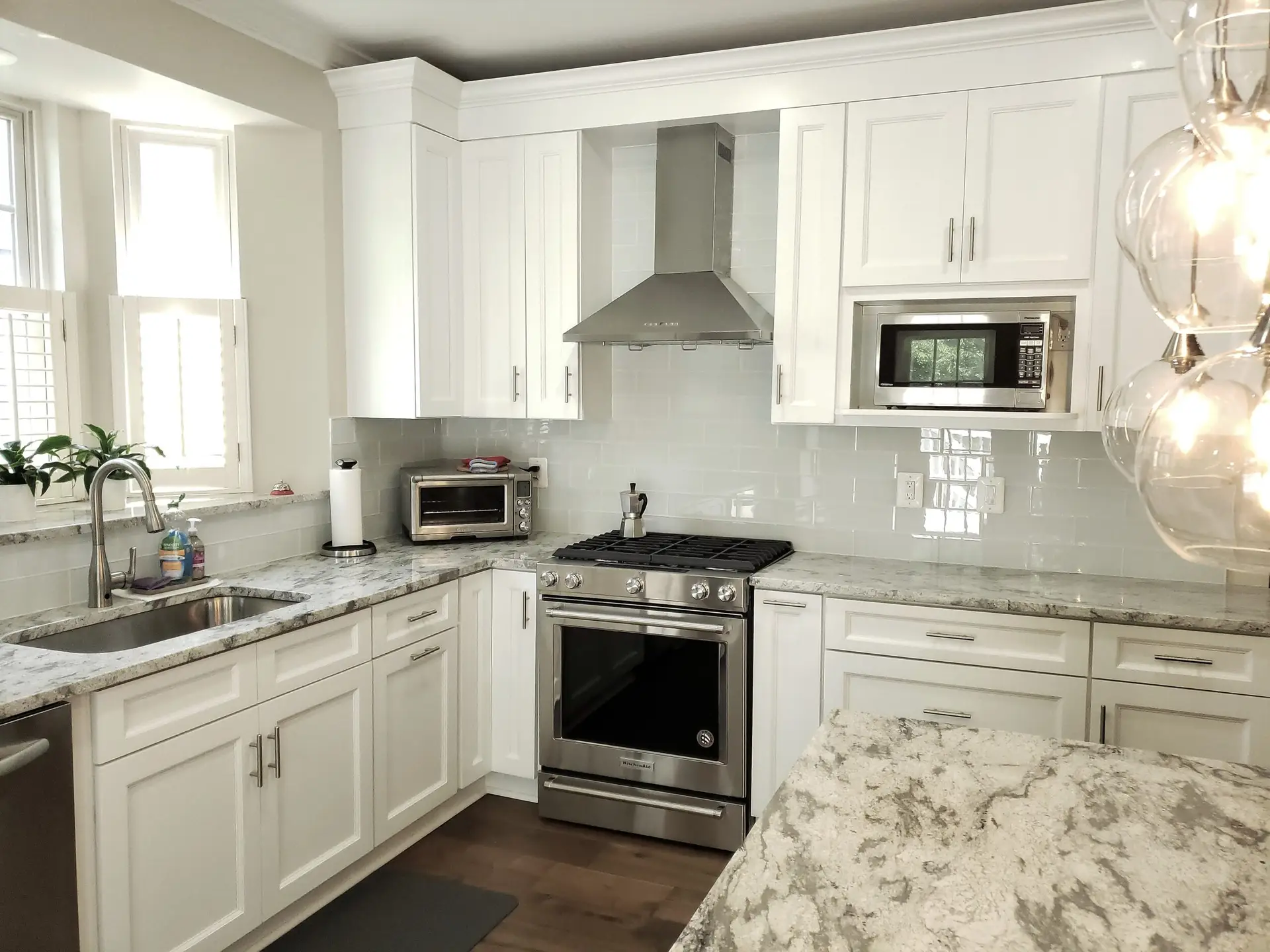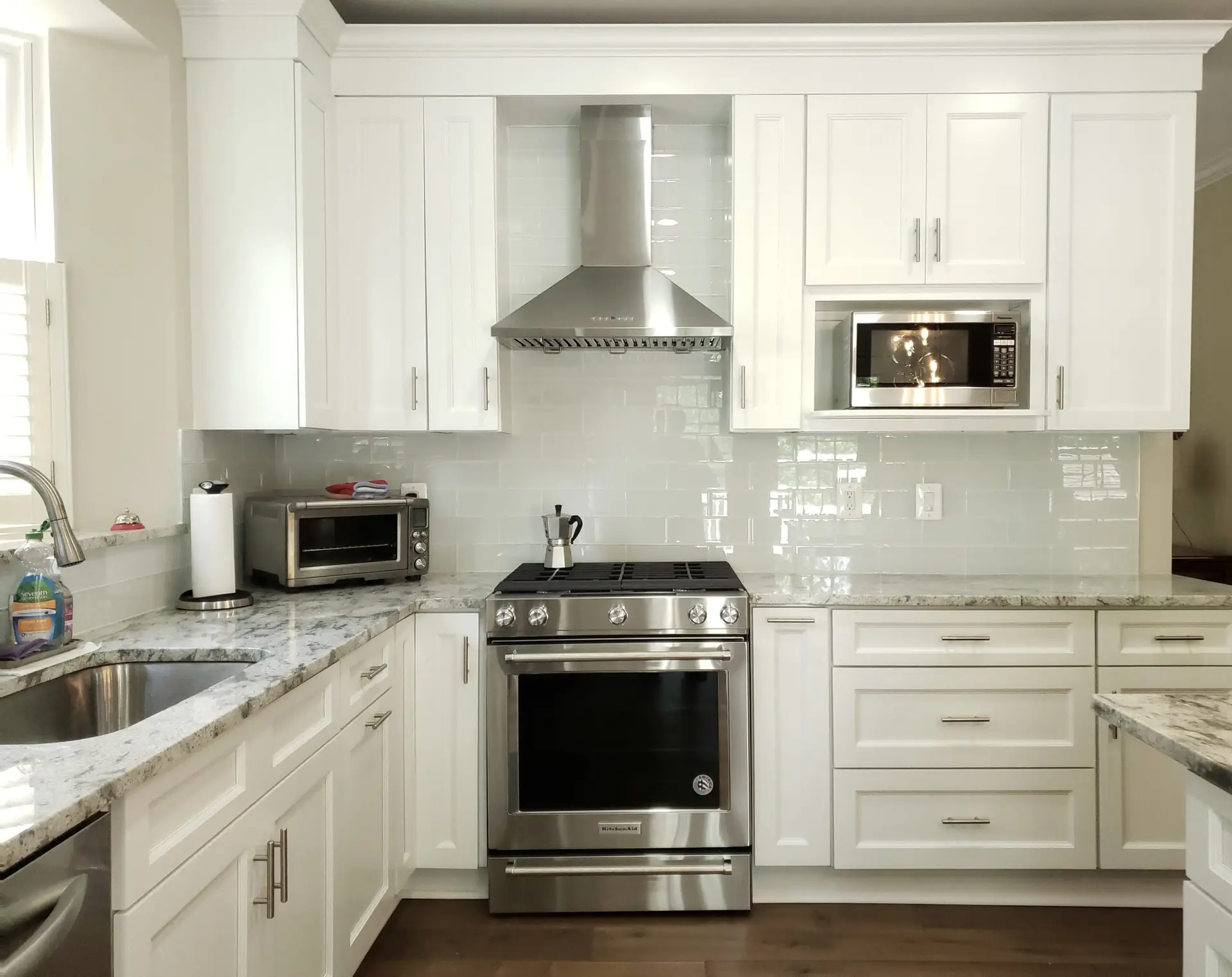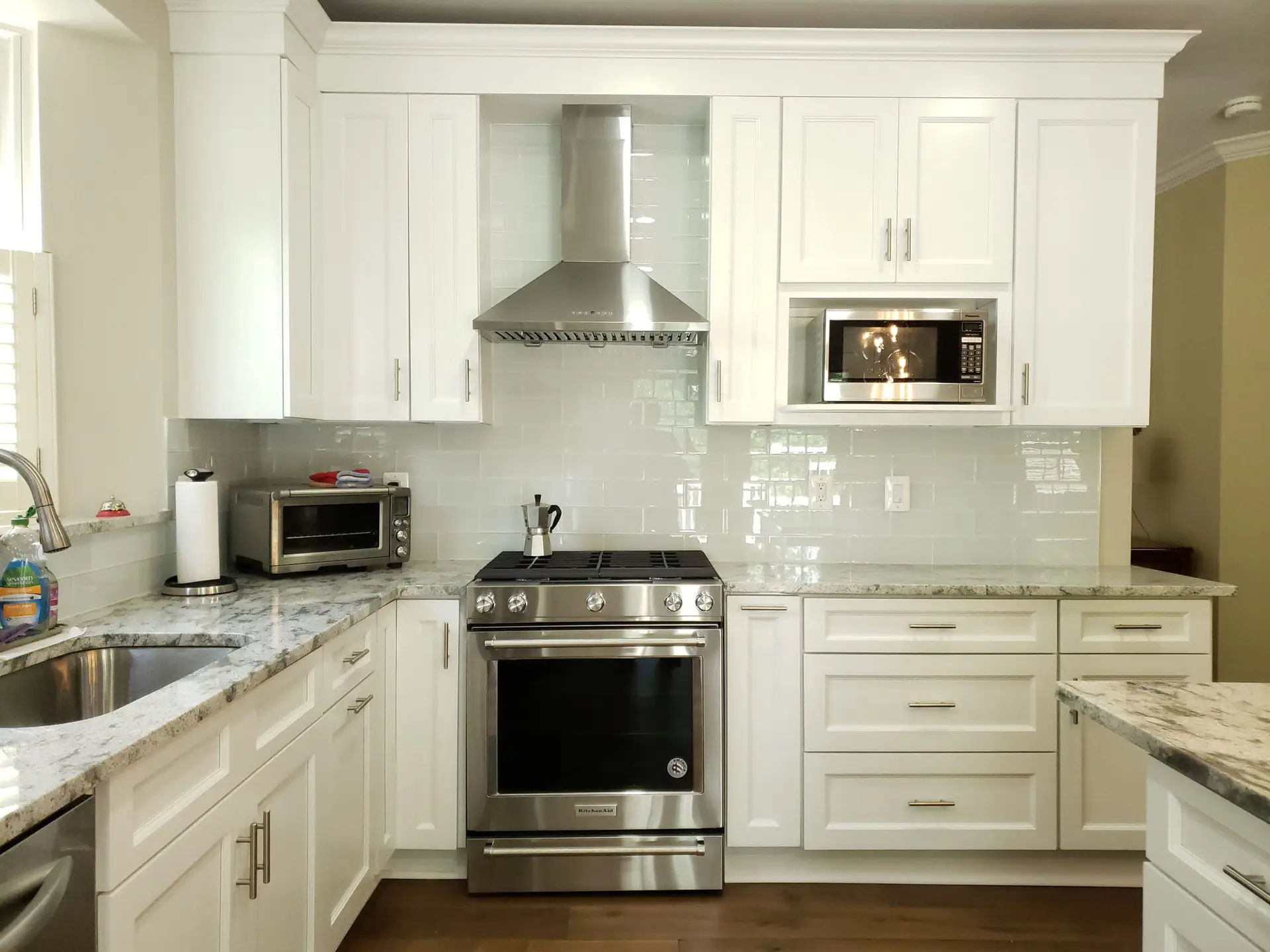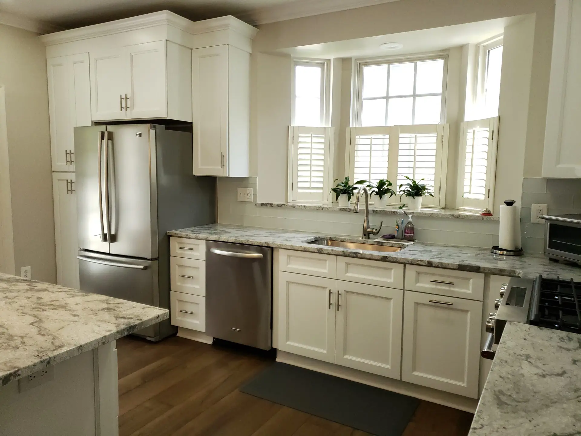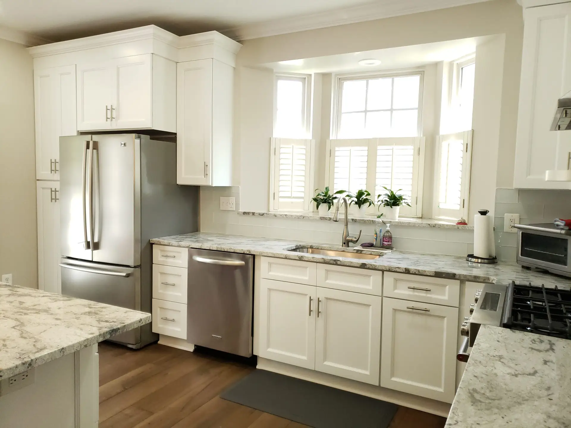 Recessed panel colonial style white cabinets were meticulously chosen, adding a touch of timeless sophistication to the space. These beautiful cabinets are elegantly complemented by stunning granite countertops, enhancing both aesthetics and durability.