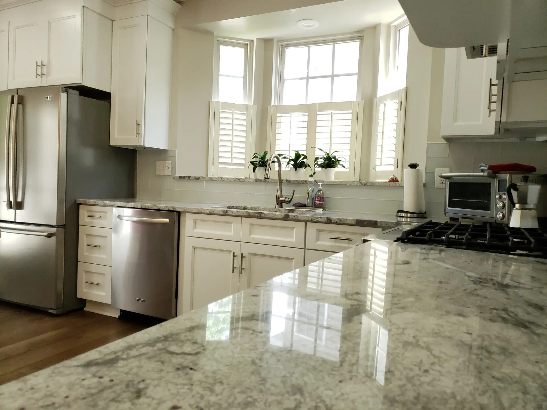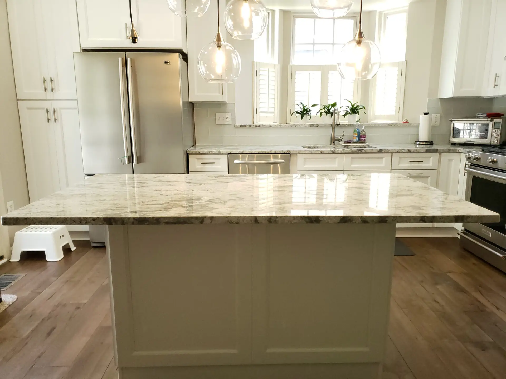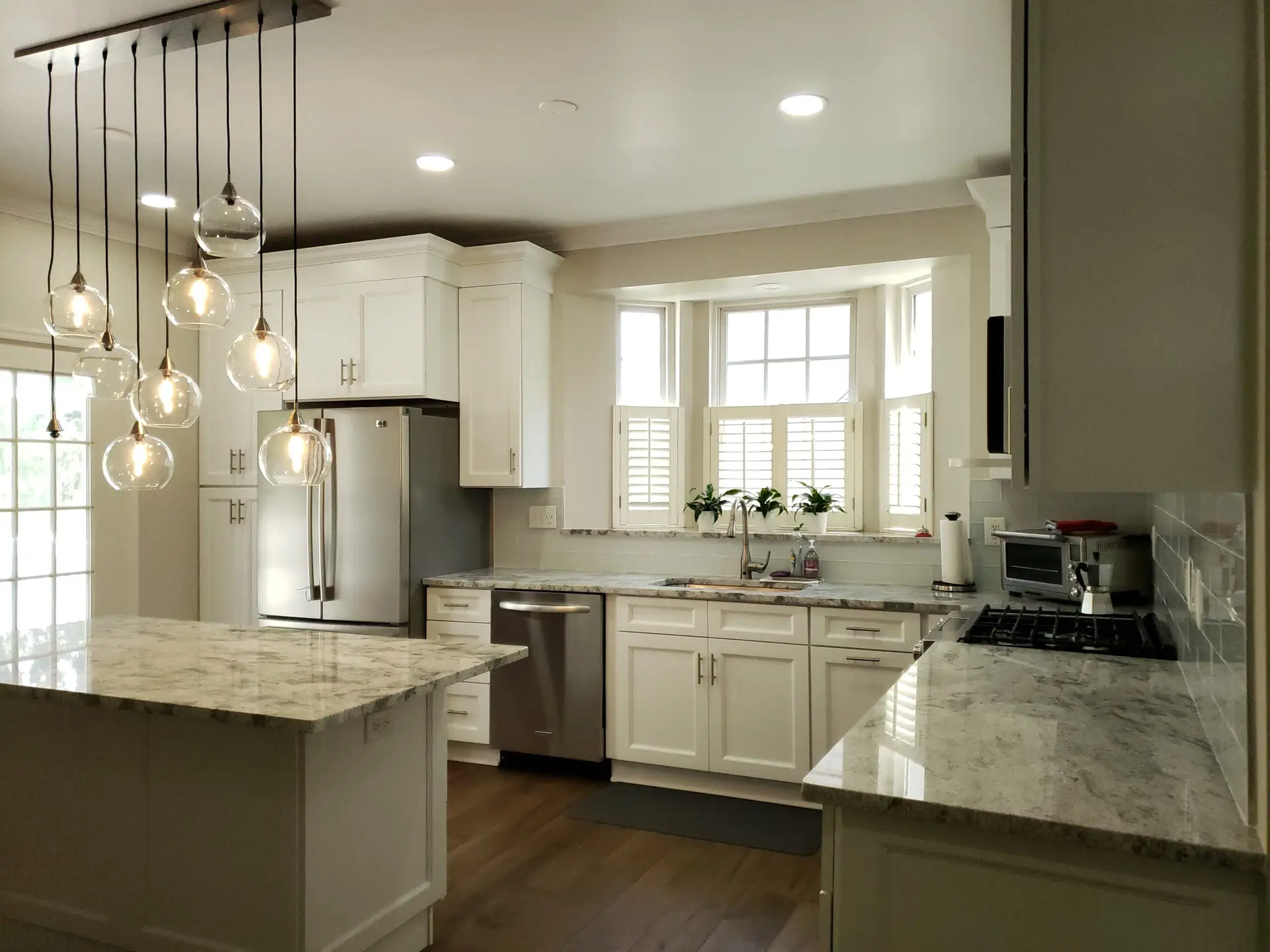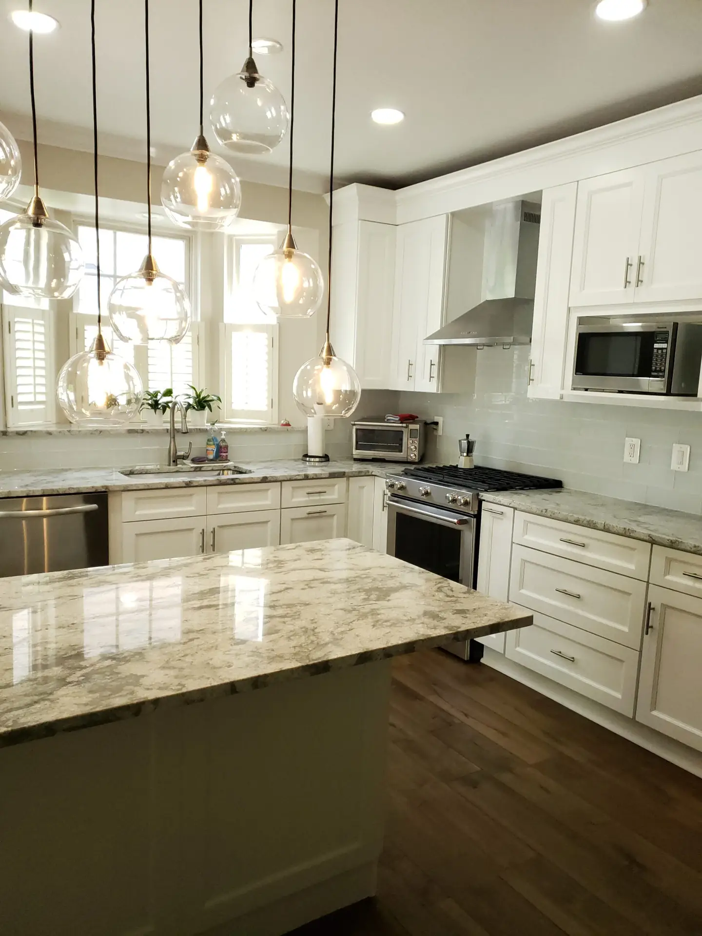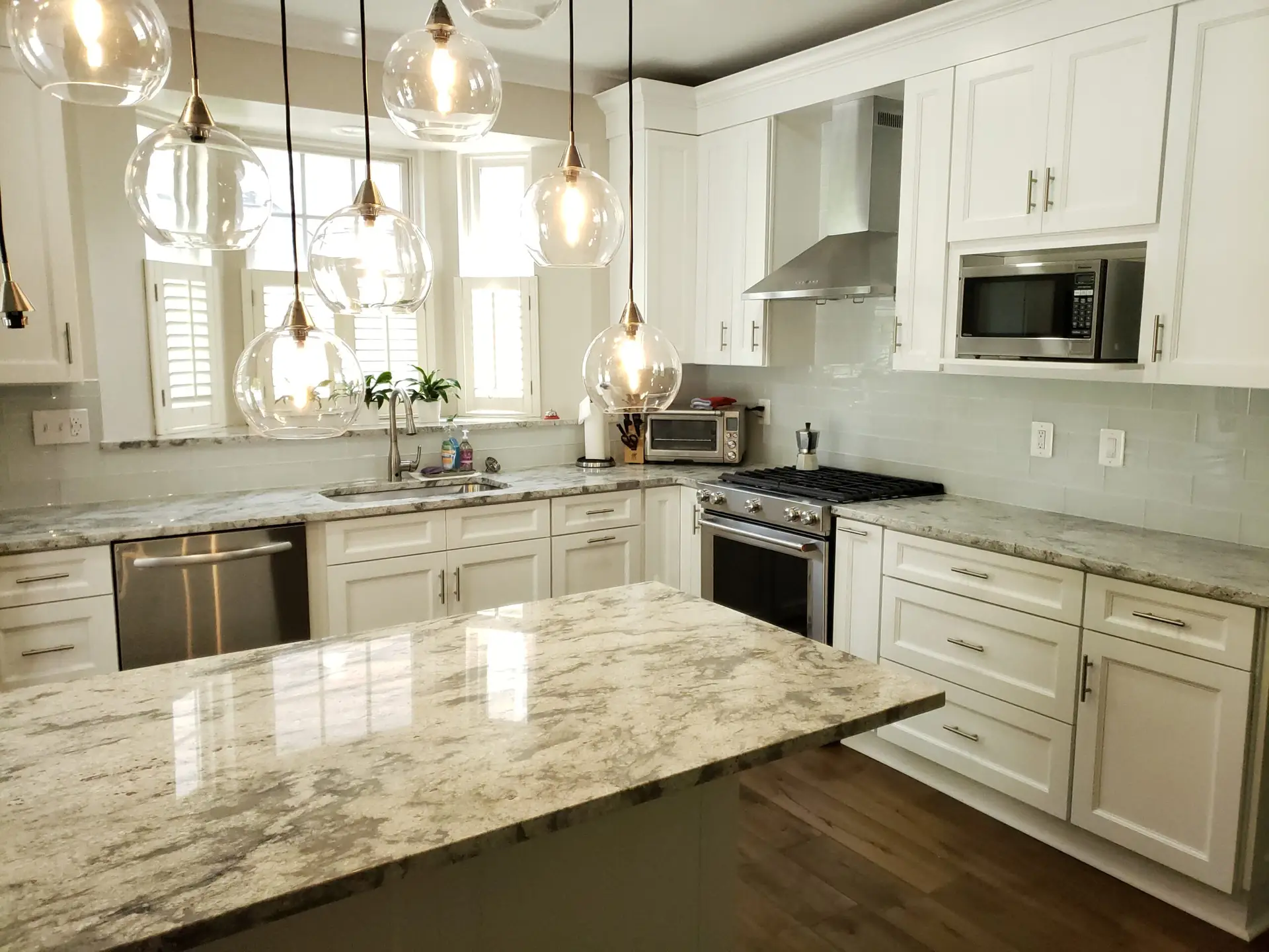 Recessed panel colonial style white cabinets were meticulously chosen, adding a touch of timeless sophistication to the space. These beautiful cabinets are elegantly complemented by stunning granite countertops, enhancing both aesthetics and durability.