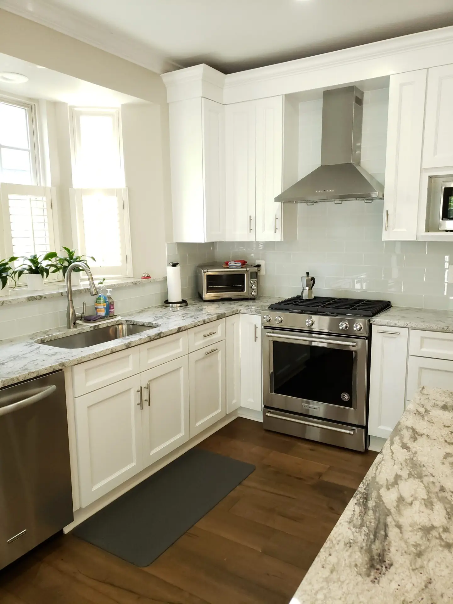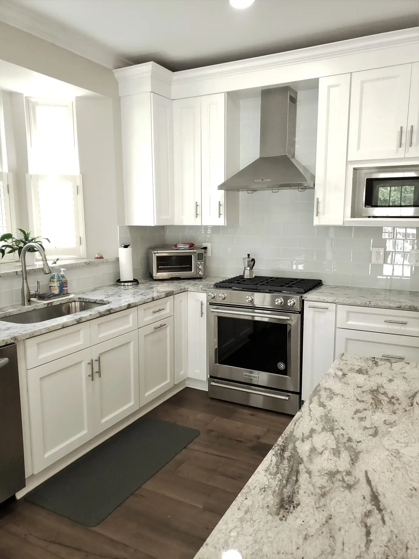 The addition of brand new stainless steel-finished appliances brought a modern edge to the kitchen. A chimney-style wall hood not only adds functionality but also contributes to the contemporary and streamlined appearance of the space.